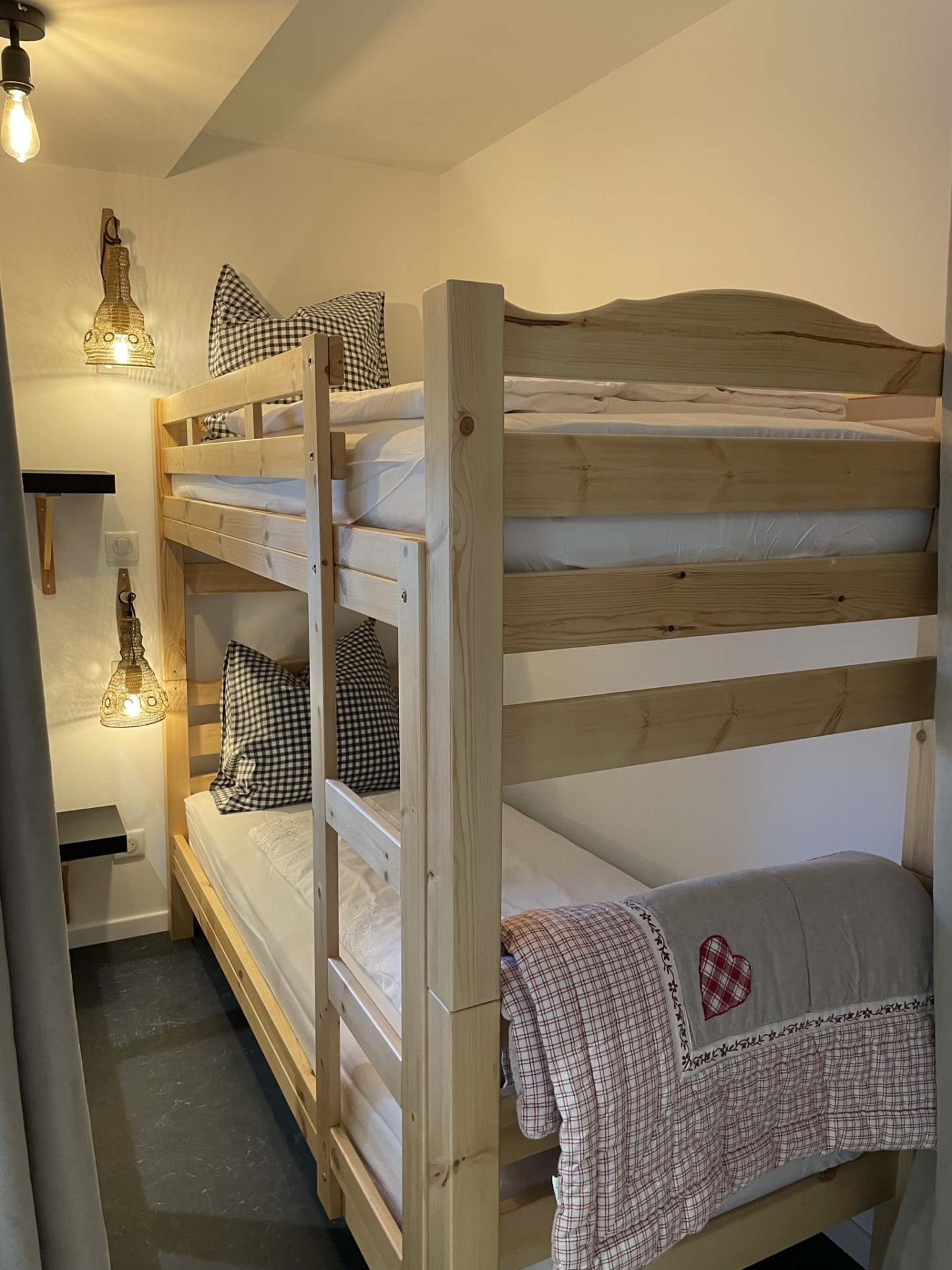 Il comprend une entrée, un salon-séjour équipé d'un poêle à bois, une cuisine équipée, une salle de bain avec WC, une grande chambre et une plus petite.